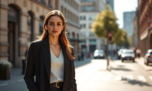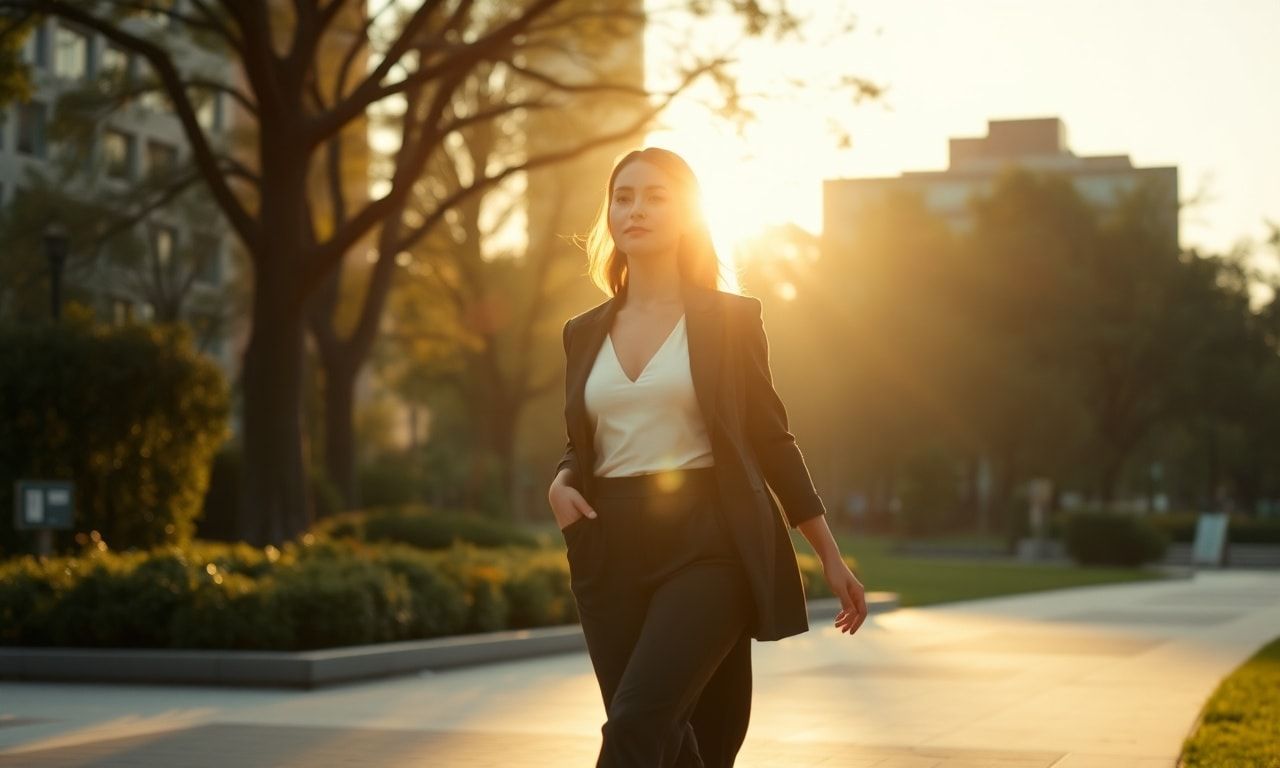 高身長の女性が街中で自信を持って歩く様子